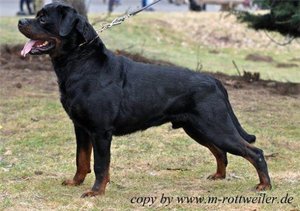 Мать щенков - состоявшаяся производительница, подарившая породе несколько ярких и высококлассных собак, полученных от вязок с разными кобелями. Данный помет - ее последние щенки, а также последний шанс для ценителей породы и профессионалов приобрести щенка ротвейлера с очень сильной родословной и высокими перспективами для спортивной карьеры и побед на выставках.